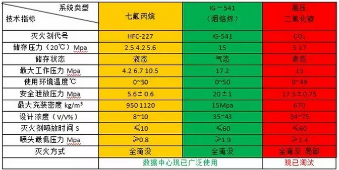 下文將針對數(shù)據(jù)中心機(jī)房中氣體滅火系統(tǒng)的選擇,講述七氟丙烷與IG541煙洛盡系統(tǒng)的對比。二氧化碳滅火系統(tǒng)會使人窒息,且在滅火過程中產(chǎn)生的殘留物對設(shè)備造成污染,現(xiàn)已很少出現(xiàn),本文只做簡單介紹。